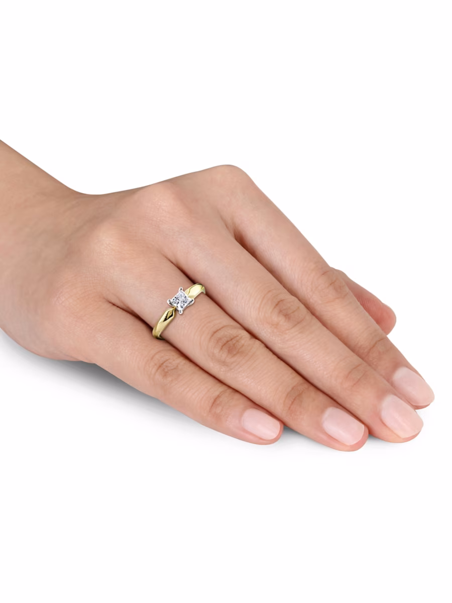 • Classic solitaire ring showcases a single 0.50 carat princess-cut diamond