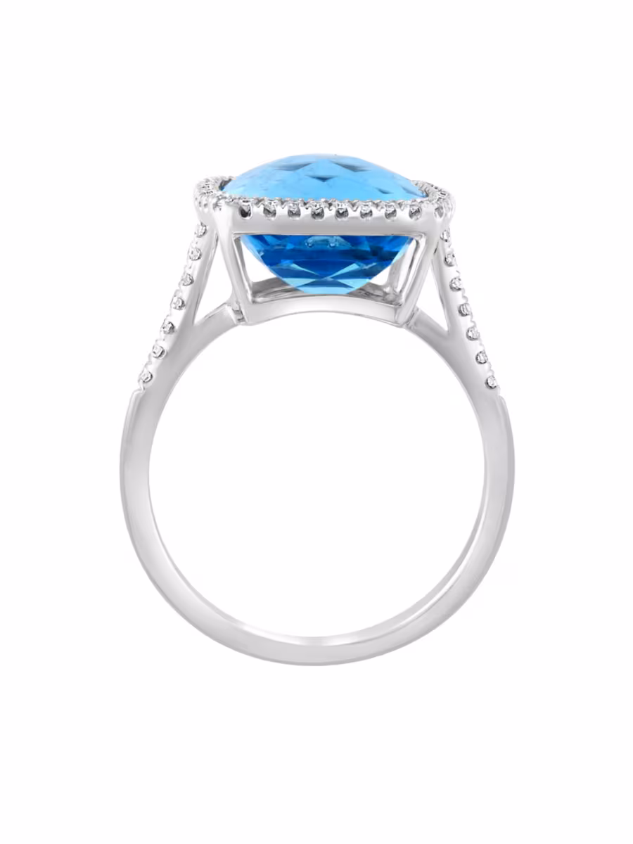 A cushion-cut, vivid blue topaz gemstone is elevated by a 14K white gold basket setting on a cocktail ring sparkling with diamond accents.
