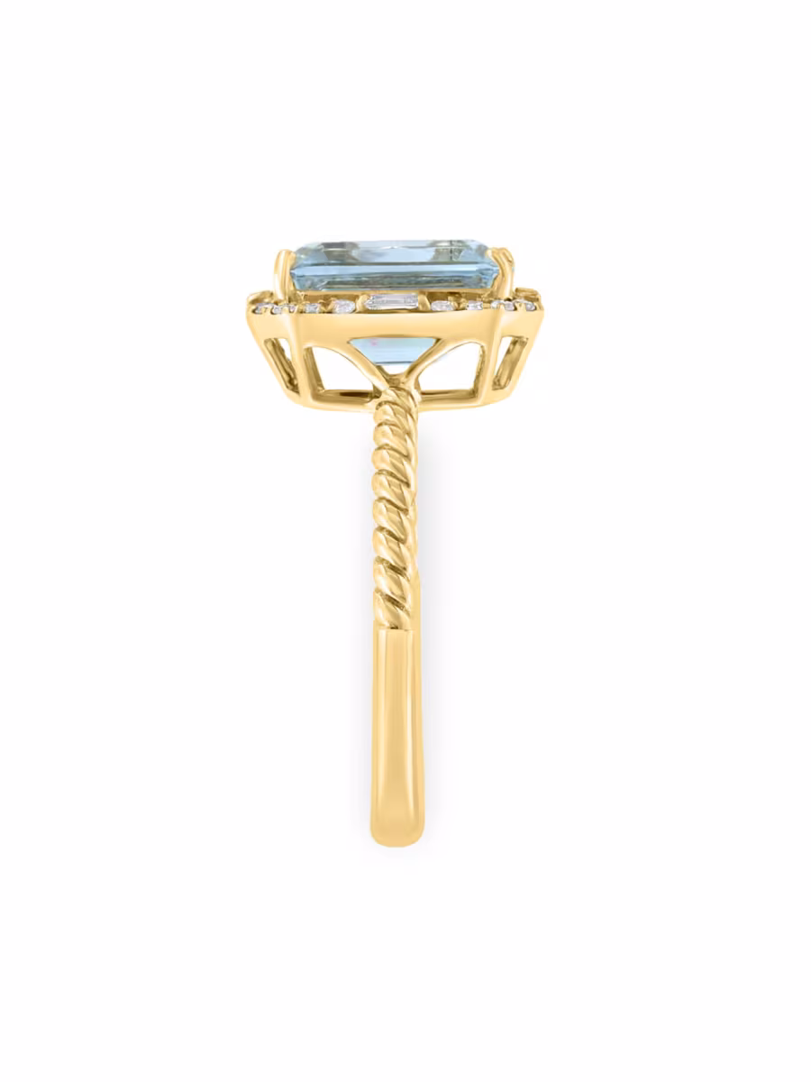Round and baquette-cut diamonds set off this 14K gold ring with an aquamarine gemstone in the centre. It's equally stunning as an engagement ring or as a cocktail ring.