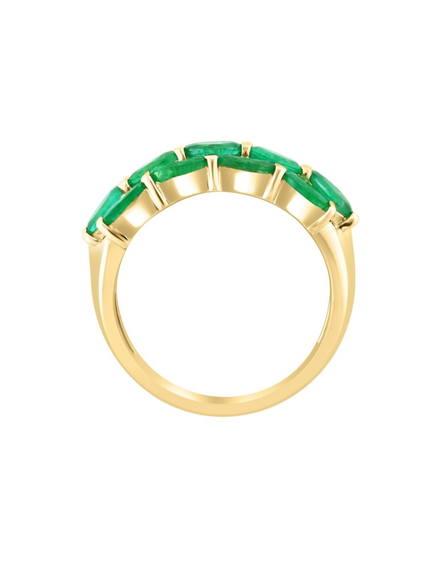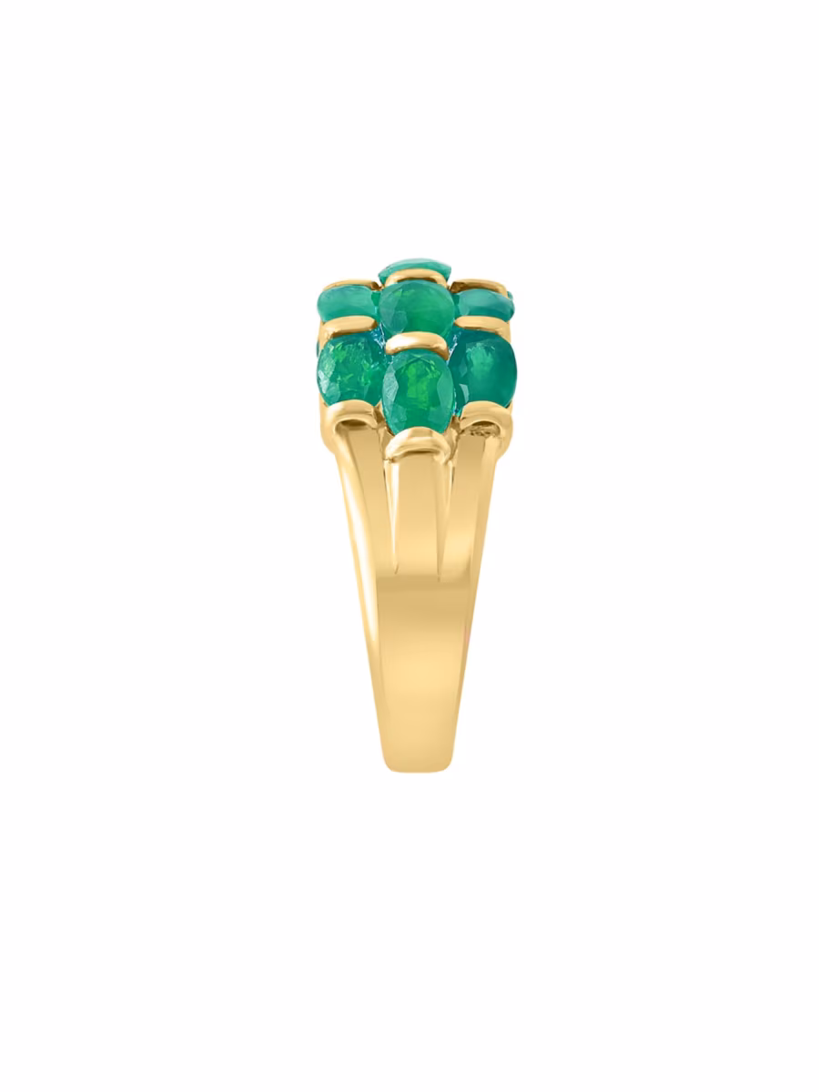 Three tiers of natural emeralds add vivid colour to this 14K gold ring.