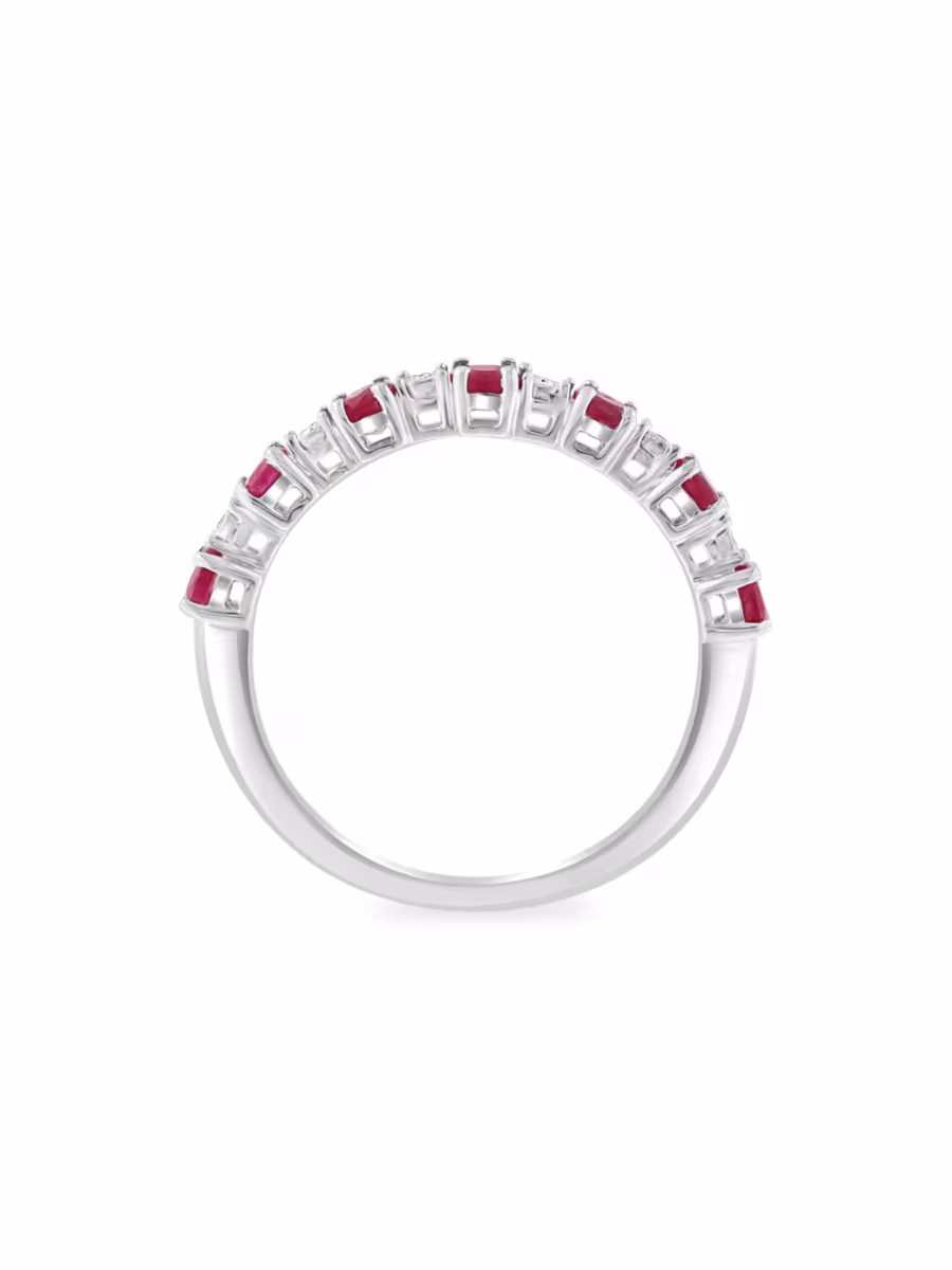 Red ruby inlays create rich colour and diamonds brighten this elegant sterling silver ring.