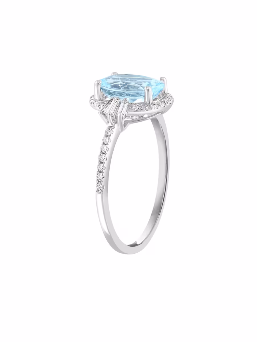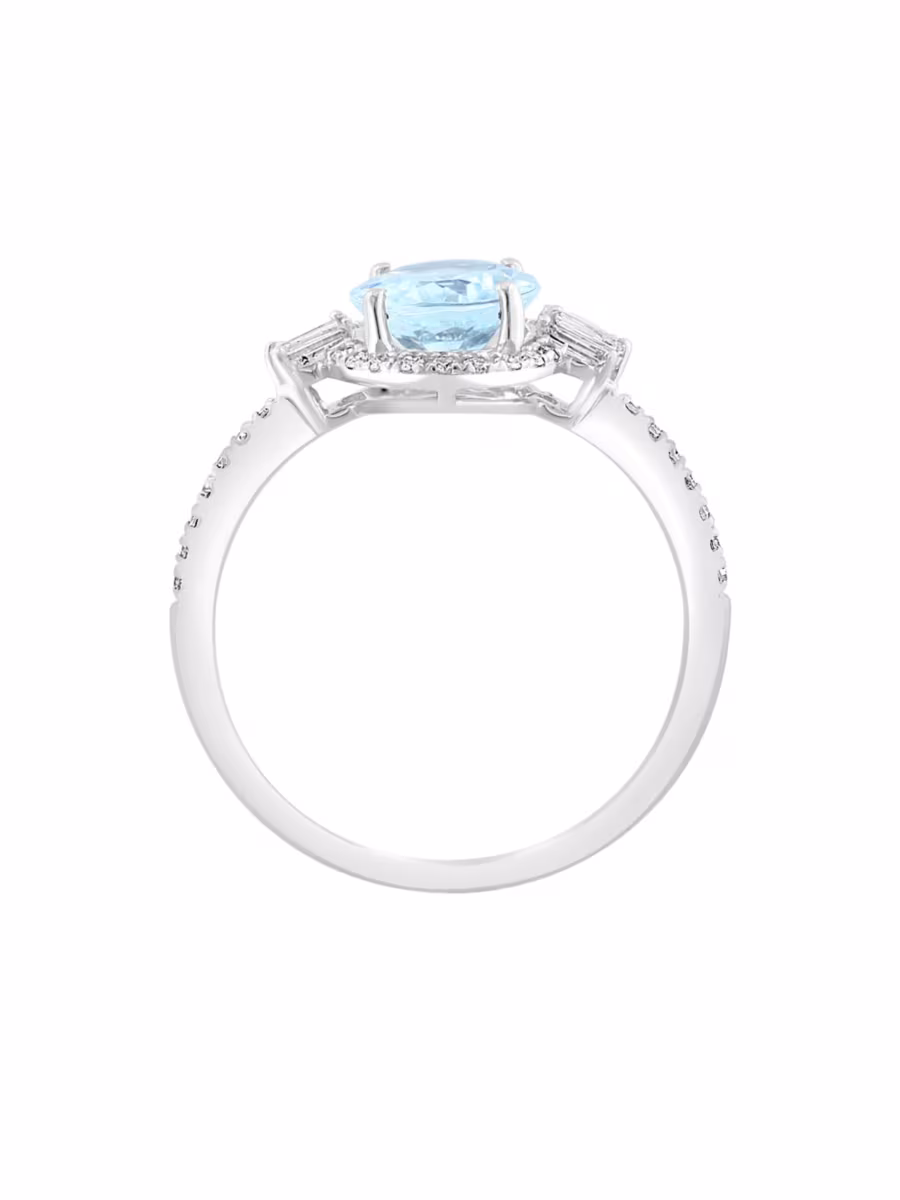 Gleaming sterling silver ring features sparkling round and baguette diamonds lining the shoulders and framing a a cool blue Aquamarine centre.