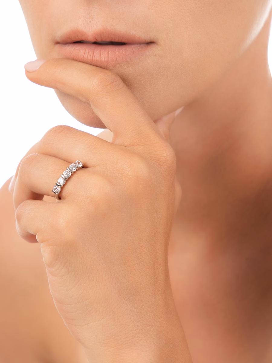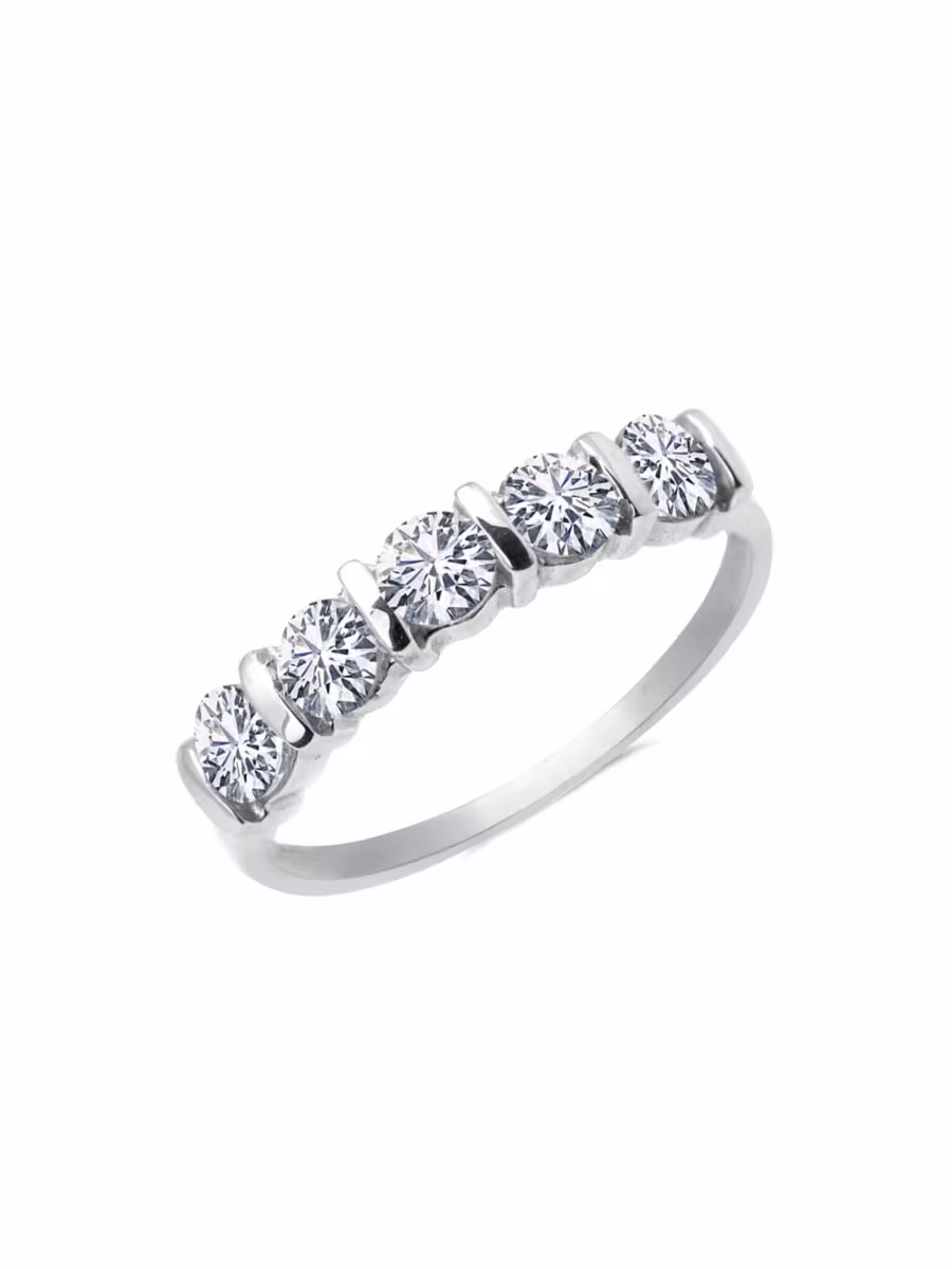 EXCLUSIVELY AT HUDSON'S BAY. A polished 10K solid white gold band shimmers with the sparkle of five bezel-set cubic zirconia.