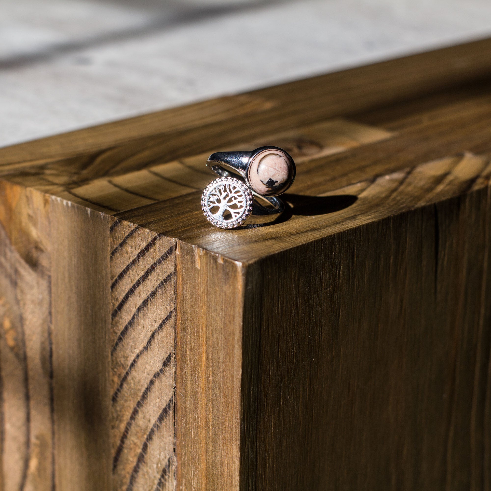 Are you drawn to the calming and grounding influence of crystals, and the liberating lifestyle they symbolize? If so, immerse yourself in the sheer beauty of our exclusive assortment of crystal rings. These exquisite wrap-around adjustable rings are a sight to behold, featuring a dazzling tree of life intricately set in a mesmerizing circular pattern, accentuated by a captivating and flawlessly cut round cabochon crystal at its center. Each ring is a fusion of elegance and spirituality, designed to resonate with your inner wanderer and free spirit.